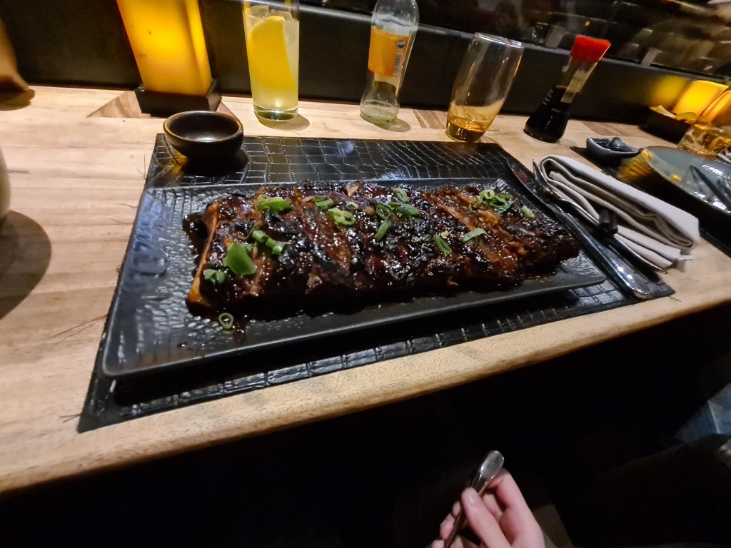 The menu was more expensive than what we are used to with almost every dish being between € 15 – € 20. My parents gave us two cards for € 100. They had shared plates both cold and warm, plus sushi. We both decided to go with something from the “Rabata” menu. I went with the “Tandoori lamb chops with roasted eggplant cream” and Nathan ended up with the “Sticky Korean bbq baby back ribs”. We got a bowl of fried rice to share and the rice felt like it melted on our tongue. We just decided to go with regular soft drinks with it.